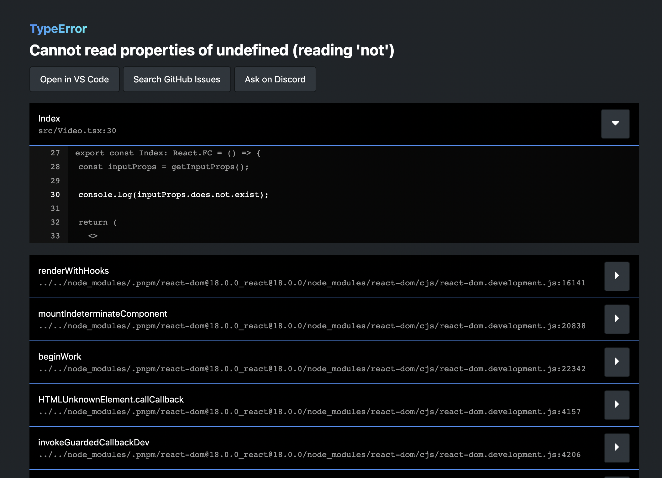 Our custom error overlay has the ability to open the troublesome file in your default editor, and look for similar GitHub issues.